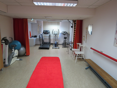De praktijk is onder in een flat gevestigd. Tussen het winkelcentrum en de hoge witte flat.